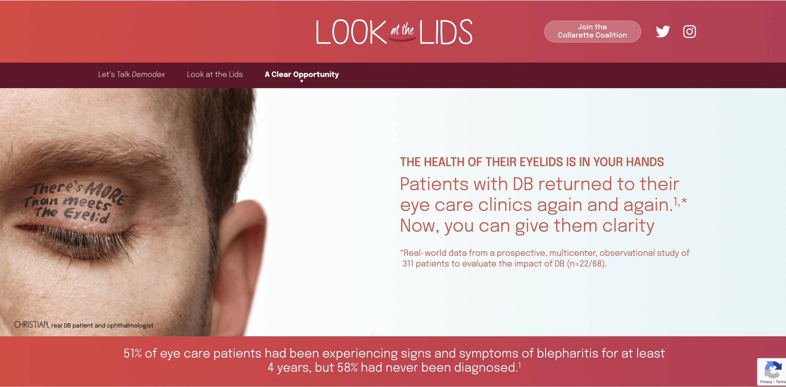 Look At the Lids was an unbranded campaign, prepping the market for a new drug for Demodex Blephoritis (eyelash mites). We wanted to encourage doctors to look out for these little buggers through one simple practice: having their patients look down. That’s why we positioned our messaging directly on the eyelids of real DB patients.
